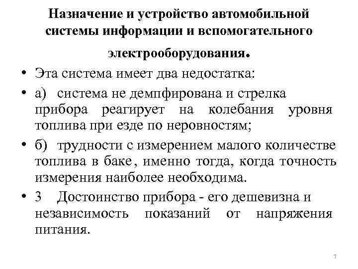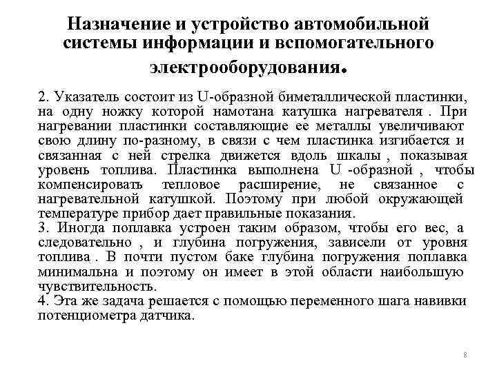 Назначение и устройство автомобильной системы информации и вспомогательного электрооборудования. • Эта система имеет два недостатка: • а) система не демпфирована и стрелка прибора реагирует на колебания уровня топлива при езде по неровностям; • б) трудности с измерением малого количестве топлива в баке , именно тогда, когда точность измерения наиболее необходима. • 3 Достоинство прибора - его дешевизна и независимость показаний от напряжения питания. 7
