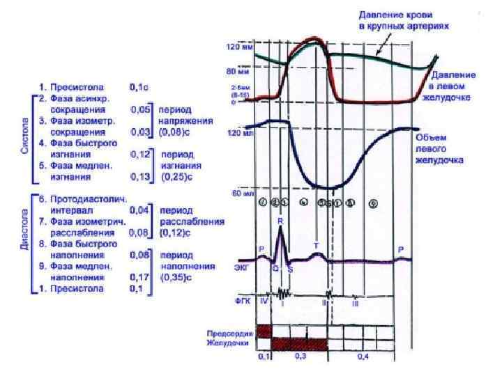 Сердечный цикл Систола желудочков Период напряжения Фаза асинхронного сокращения Фаза изометрического сокращения Период изгнания Фаза быстрого изгнания Фаза медленного изгнания Диастола желудочков Период расслабления Протодиастолическая фаза Фаза изометрического расслабления Период наполнения Фаза быстрого наполнения Фаза медленного наполнения Период систолы предсердий (пресистола)