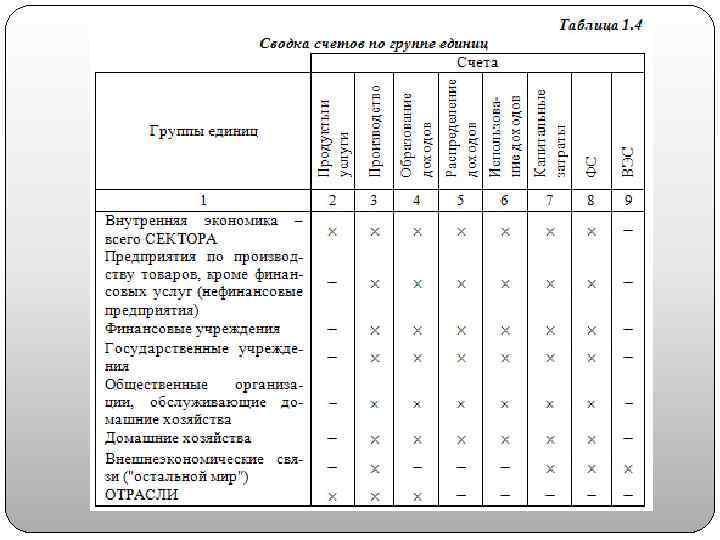Счета 2. 3. Счет перераспределения доходов в натуральной форме 2. 4. Счета использования доходов: 2. 4. 1. Счет использования распола гаемого дохода 2. 4. 2. Счет использования скоррективанного располагаемого дохода 3. Счета накопления 3. 1. Счет операций с капиталом 3. 2. Финансовый счет 3. 3. Счета др. изменений в активах Балансирующая статья ЧРД Валовое сбережение Чистое кредитование (+) / чистое заимствование ( ) Изменения в чистой стоимости капитала, обусловленные прочими изменениями в активах 4. Балансы активов и пассивов 4. 1. Начальный баланс активов и пассивов 4. 2. Изменения в балансе активов и пассивов 4. 3. Заключительный баланс активов и пассивов Чистая стоимость капитала Изменения в чистой стоимости капитала