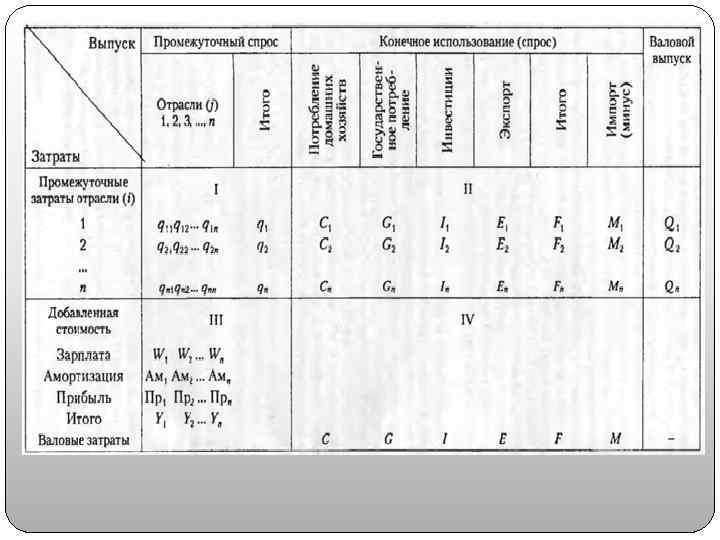 Таблица «Затраты – Выпуск» Но Продукты * мер сельского. . . стро хозяйства и ки охоты Продукты * А Продукты сельского хозяйства и охоты. . . Коммунальные, социальные и персональные услуги Транспортная наценка на использованные товары Торговая наценка на использованные товары Чистые налоги на продукты и на использованные товары и услуги Итого использовано в ценах покупателей Оплата труда работников Валовая прибыль Валовой смешанный доход Другие налоги на производство Другие субсидии на производство ( ) Косвенно измеряемые услуги финансового посредничества Валовая добавленная стоимость в основных ценах Выпуск товаров и услуг в основных ценах Б 1 . . . Коммуналь Косвенно Промежу т Расходы на Валовое Изменени Экспорт Всего Импорт ные, измеряемые очный конечное накоплен е запасов товаров использован товаров социальные услуги спрос потреблени ие материаль и услуг о ресурсов и услуг и финансовог е основного ных товаров и персональ н о капитала оборотных услуг в ые услуги посред ниче средств основных ства ценах 30 31 32 33 34 35 1. . . 30 I квадрант 31 32 33 34 35 36 37 38 39 40 41 42 III квадрант 36 37 38 Всего использован о отечествен н ых товаров и услуг в основных ценах 39