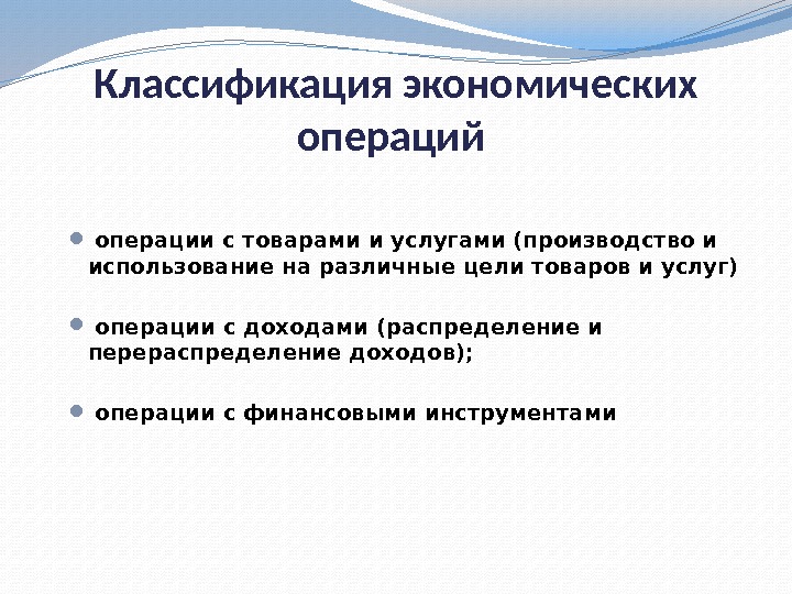 Классификация экономических операций операции с товарами и услугами (производство и использо вание на различные цели товаров и услуг) операции с доходами (распределение и перераспределение доходов); операции с финансовыми инструментами