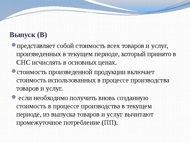 Выпуск (В) представляет собой стоимость всех товаров и услуг, произведенных в текущем периоде, который принято в СНС исчислять в основных ценах. стоимость произведенной продукции включает стоимость использованных в процессе производства товаров и услуг. если необходимо получить вновь созданную стоимость в процессе производства в текущем периоде, из выпуска товаров и услуг вычитают промежуточное потребление (ПП).