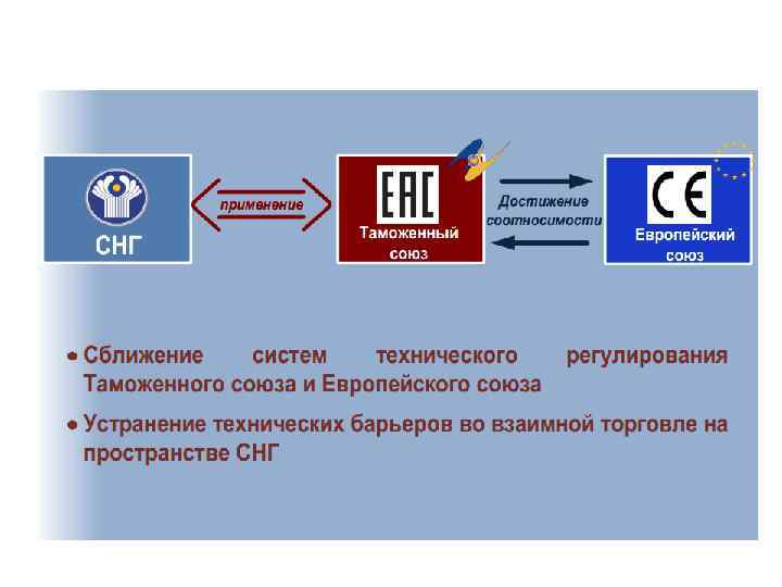 Единые принципы и правила технического регулирования в странах ТС • СОДЕРЖАЩИЕСЯ В ТР ОБЯЗАТЕЛЬНЫЕ ТРЕБОВАНИЯ ИМЕЮТ ПРЯМОЕ ДЕЙСТВИЕ НА ТЕРРИТОРИИ ГОСУДАРСТВ СТОРОН • ПО СОГЛАСОВАНИЮ СТОРОН В ИСКЛЮЧИТЕЛЬНЫХ СЛУЧАЯХ В ТР МОЖЕТ БЫТЬ ПРЕДУСМОТРЕНО НЕПРИМЕНЕНИЕ ОТДЕЛЬНЫХ ТРЕБОВАНИЙ НА ОПРЕДЕЛЕННЫХ ТЕРРИТОРИЯХ ГОСУДАРСТВ СТОРОН • СТОРОНЫ ПРОВОДЯТ СОГЛАСОВАННУЮ ПОЛИТИКУ В ОБЛАСТИ ГОСУДАРСТВЕННОГО КОНТРОЛЯ (НАДЗОРА) И УСТАНОВЛЕНИЯ ОТВЕТСТВЕННОСТИ ЗА НАРУШЕНИЯ В СФЕРЕ ТЕХНИЧЕСКОГО РЕГУЛИРОВАНИЯ • ДЛЯ ЦЕЛЕЙ ОЦЕНКИ (ПОДТВЕРЖДЕНИЯ) СООТВЕТСТВИЯ ТРЕБОВАНИЯМ ТР ПРИМЕНЯЮТСЯ МЕЖГОСУДАРСТВЕННЫЕ СТАНДАРТЫ (ГОСТ), А В СЛУЧАЕ ИХ ОТСУТСТВИЯ – НАЦИОНАЛЬНЫЕ (ГОСУДАРСТВЕННЫЕ) СТАНДАРТЫ СТОРОН • СТОРОНЫ ФОРМИРУЮТ ЕДИНУЮ ИНФОРМАЦИОННУЮ СИСТЕМУ В ОБЛАСТИ ТЕХНИЧЕСКОГО РЕГУЛИРОВАНИЯ