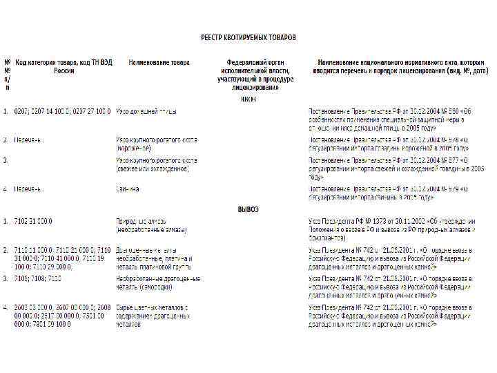 Полномочия Правительства РФ в сфере торговых ограничений • 1) обеспечивает проведение в Российской Федерации единой торговой политики и осуществляет меры по ее реализации, принимает соответствующие решения и обеспечивает их выполнение; • 2) применяет специальные защитные меры, антидемпинговые меры и компенсационные меры при осуществлении внешней торговли товарами, а также иные меры по защите экономических интересов Российской Федерации; • 3) вводит количественные ограничения экспорта и импорта товаров в соответствии с международными договорами Российской Федерации, федеральными законами и определяет порядок применения количественных ограничений экспорта и импорта товаров; • 4) устанавливает разрешительный порядок экспорта и (или) импорта отдельных видов товаров, которые могут оказать неблагоприятное воздействие на безопасность государства, жизнь или здоровье граждан.