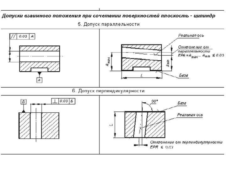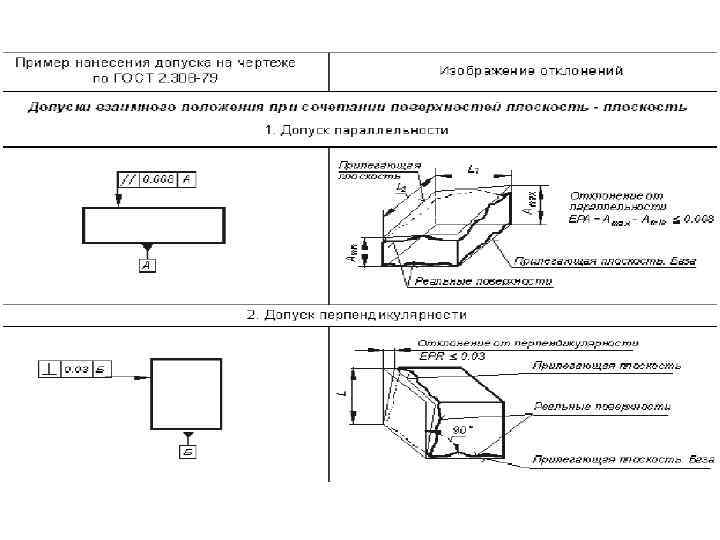 Допуск перпендикулярности Отклонение от перпендикулярности плоскостей – отклонение угла между плоскостями от прямого угла (90°), выраженное в линейных единицах на длине нормируемого участка. Допуск перпендикулярности – наибольшее допускаемое значение отклонения от перпендикулярности. Для нормирования перпендикулярности кроме линейных допусков могут быть применены способы, основанные на указании предельного отклонения от прямого угла в угловых единицах.