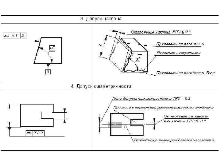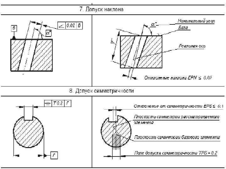 Допуск наклона Отклонения наклона плоскости относительно плоскости или оси (прямой) – отклонение угла между плоскостью и базовой плоскостью или базовой осью (прямой) от номинального угла, выраженное в линейных единицах Δ , на длине нормируемого участка. Допуск наклона – наибольшее допускаемое значение отклонения наклона. Для нормирования углов между элементами указывают либо значения допусков наклона по стандарту, либо значения отдельных отклонений от номинального угла в угловых единицах.
