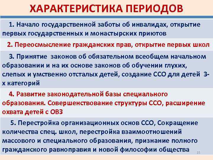 ПЕРИОДИЗАЦИЯ ПРОЦЕССА ЭВОЛЮЦИИ ОТНОШЕНИЯ ОБЩЕСТВА И ГОСУДАРСТВА К ЛЮДЯМ С ОВЗ (ПО Н. Н. МАЛОФЕЕВУ) Период Название периода Сроки в Зап. Европе Сроки в России 1 период От агрессии и нетерпимости к 1198 1706 - 1715 2 период От осознания необходимости 1770 -1784 1806 - 1807 3 период От осознания возможности к 1775 - 1800 1927 - 1935 4 период От осознания необходимости Начало XX в. 1950 - 1990 – конец 70 -х 5 период От изоляции к интеграции лиц с ОВЗ 1980 - 1990 осознанию необходимости заботиться о людях с ОВЗ призрения лиц с ОВЗ к осознанию возможности обучения части из них осознанию целесообразности обучения детей 3 -х категорий (НС, НЗ, умственная отсталость) обучения части лиц с ОВЗ к пониманию необходимости обучения всех детей 1991 14