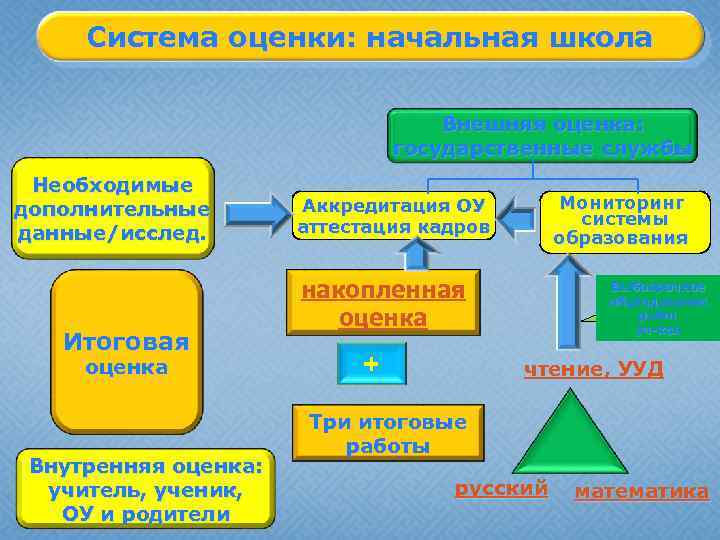 Система оценки: начальная школа Внешняя оценка: государственные службы Необходимые дополнительные данные/исслед. Итоговая оценка Внутренняя оценка: учитель, ученик, ОУ и родители Мониторинг системы образования Аккредитация ОУ аттестация кадров накопленная оценка + Выбоорочное обследование работ уч-хся чтение, УУД Три итоговые работы русский математика