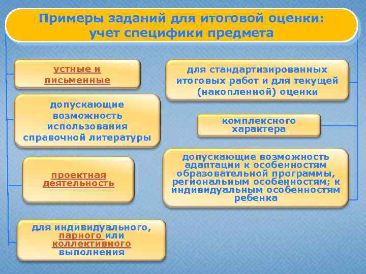 Примеры заданий для итоговой оценки: учет специфики предмета устные и письменные допускающие возможность использования справочной литературы проектная деятельность для индивидуального, парного или коллективного выполнения для стандартизированных итоговых работ и для текущей (накопленной) оценки комплексного характера допускающие возможность адаптации к особенностям образовательной программы, региональным особенностям; к индивидуальным особенностям ребенка