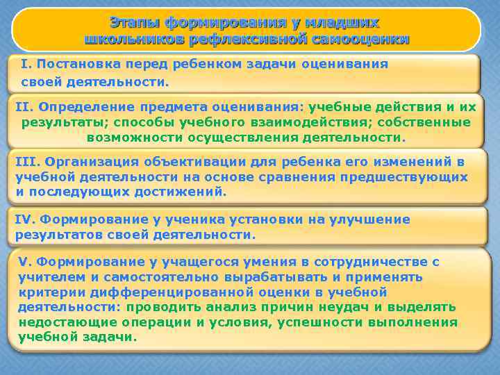 I. Постановка перед ребенком задачи оценивания своей деятельности. II. Определение предмета оценивания: учебные действия и их результаты; способы учебного взаимодействия; собственные возможности осуществления деятельности. III. Организация объективации для ребенка его изменений в учебной деятельности на основе сравнения предшествующих и последующих достижений. IV. Формирование у ученика установки на улучшение результатов своей деятельности. V. Формирование у учащегося умения в сотрудничестве с учителем и самостоятельно вырабатывать и применять критерии дифференцированной оценки в учебной деятельности: проводить анализ причин неудач и выделять недостающие операции и условия, успешности выполнения учебной задачи.
