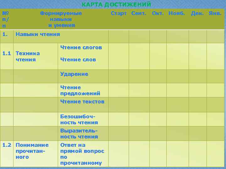 КАРТА ДОСТИЖЕНИЙ № п/ п 1. Формируемые навыки и умения Навыки чтения 1. 1 Техника чтения Чтение слогов Чтение слов Ударение Чтение предложений Чтение текстов Безошибочность чтения Выразительность чтения 1. 2 Понимание прочитанного Ответ на прямой вопрос по прочитанному Старт Сент. Окт. Нояб. Дек. Янв.