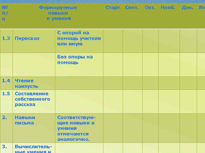 № п/ п Формируемые навыки и умения 1. Навыки чтения С опорой на 1. 3 Пересказ помощь учителя или иную Чтение слогов 1. 1 Техника чтения Чтение слов Без опоры на помощь Ударение 1. 4 Чтение наизусть Чтение предложений 1. 5 Составление собственного расскза Чтение текстов 2. Навыки письма 1. 2 Понимание прочитанного 3. Вычислитель- Безошибочность чтения Соответствую. Выразительщие навыки и ность чтения умения Ответ на прямой отмечаются вопрос по аналогично. прочитанному Старт Сент. Окт. Нояб. Дек. Ян