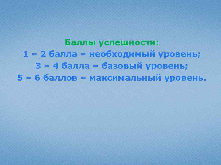 Баллы успешности: 1 – 2 балла – необходимый уровень; 3 – 4 балла – базовый уровень; 5 – 6 баллов – максимальный уровень.