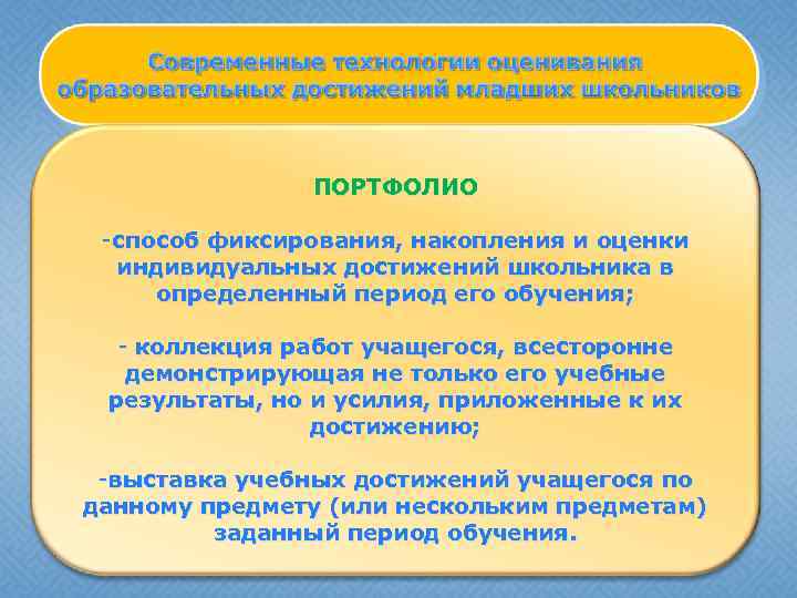 ПОРТФОЛИО -способ фиксирования, накопления и оценки индивидуальных достижений школьника в определенный период его обучения; - коллекция работ учащегося, всесторонне демонстрирующая не только его учебные результаты, но и усилия, приложенные к их достижению; -выставка учебных достижений учащегося по данному предмету (или нескольким предметам) заданный период обучения.