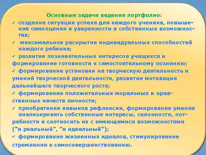 Основные задачи ведения портфолио: ü создание ситуации успеха для каждого ученика, повышение самооценки и уверенности в собственных возможностях; ü максимальное раскрытие индивидуальных способностей каждого ребенка; ü развитие познавательных интересов учащихся и формирование готовности к самостоятельному познанию; ü формирование установки на творческую деятельность и умений творческой деятельности, развитие мотивации дальнейшего творческого роста; ü формирование положительных моральных и нравственных качеств личности; ü приобретение навыков рефлексии, формирование умения анализировать собственные интересы, склонности, потребности и соотносить их с имеющимися возможностями ("я реальный", "я идеальный"); ü формирование жизненных идеалов, стимулирование стремления к самосовершенствованию.