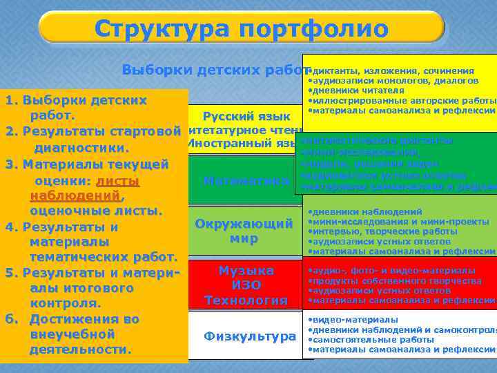 Структура портфолио Выборки детских работ • диктанты, изложения, сочинения • аудиозаписи монологов, диалогов • дневники читателя • иллюстрированные авторские работы • материалы самоанализа и рефлексии 1. Выборки детских работ. Русский язык Литетатурное чтение 2. Результаты стартовой • Иностранный языкматематические диктанты диагностики. • мини-исследования, • модели, решения задач 3. Материалы текущей Математика • аудиозаписи устных ответов оценки: листы • материалы самоанализа и рефлек наблюдений, • дневники наблюдений оценочные листы. Окружающий • мини-исследования и мини-проекты 4. Результаты и • интервью, творческие работы мир • аудиозаписи устных ответов материалы • материалы самоанализа и рефлексии тематических работ. • аудио-, фото- и видео-материалы Музыка 5. Результаты и матери • продукты собственного творчества ИЗО алы итогового • аудиозаписи устных ответов • материалы самоанализа и рефлексии Технология контроля. • видео-материалы 6. Достижения во • дневники наблюдений и самоконтроля внеучебной Физкультура • самостоятельные работы • материалы самоанализа и рефлексии деятельности.