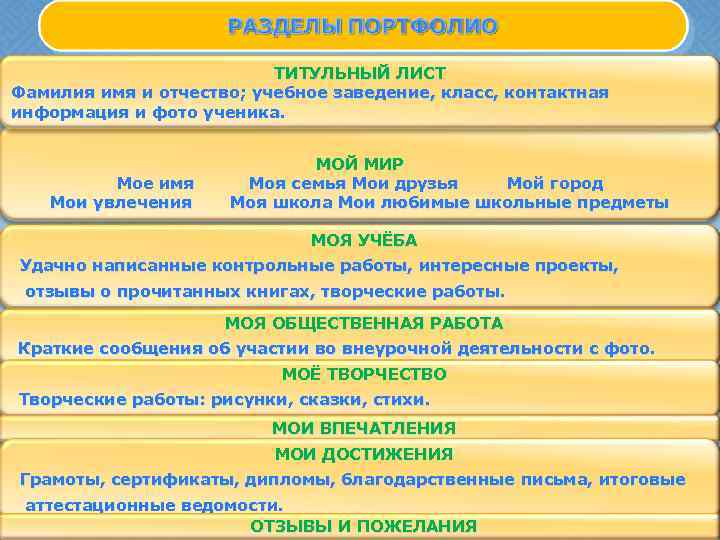 ТИТУЛЬНЫЙ ЛИСТ Фамилия имя и отчество; учебное заведение, класс, контактная информация и фото ученика. Мое имя Мои увлечения МОЙ МИР Моя семья Мои друзья Мой город Моя школа Мои любимые школьные предметы МОЯ УЧЁБА Удачно написанные контрольные работы, интересные проекты, отзывы о прочитанных книгах, творческие работы. МОЯ ОБЩЕСТВЕННАЯ РАБОТА Краткие сообщения об участии во внеурочной деятельности с фото. МОЁ ТВОРЧЕСТВО Творческие работы: рисунки, сказки, стихи. МОИ ВПЕЧАТЛЕНИЯ МОИ ДОСТИЖЕНИЯ Грамоты, сертификаты, дипломы, благодарственные письма, итоговые аттестационные ведомости. ОТЗЫВЫ И ПОЖЕЛАНИЯ