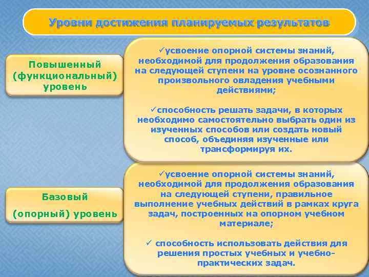 Повышенный (функциональный) уровень üусвоение опорной системы знаний, необходимой для продолжения образования на следующей ступени на уровне осознанного произвольного овладения учебными действиями; üспособность решать задачи, в которых необходимо самостоятельно выбрать один из изученных способов или создать новый способ, объединяя изученные или трансформируя их. Базовый (опорный) уровень üусвоение опорной системы знаний, необходимой для продолжения образования на следующей ступени, правильное выполнение учебных действий в рамках круга задач, построенных на опорном учебном материале; ü способность использовать действия для решения простых учебных и учебнопрактических задач.