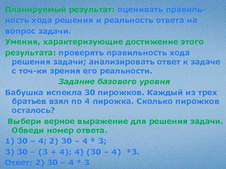 Планируемый результат: оценивать правильность хода решения и реальность ответа на вопрос задачи. Умения, характеризующие достижение этого результата: проверять правильность хода решения задачи; анализировать ответ к задаче с точ-ки зрения его реальности. Задание базового уровня Бабушка испекла 30 пирожков. Каждый из трех братьев взял по 4 пирожка. Сколько пирожков осталось? Выбери верное выражение для решения задачи. Обведи номер ответа. 1) 30 – 4; 2) 30 – 4 * 3; 3) 30 – (3 + 4); 4) (30 – 4) *3. Ответ: 2) 30 – 4 * 3