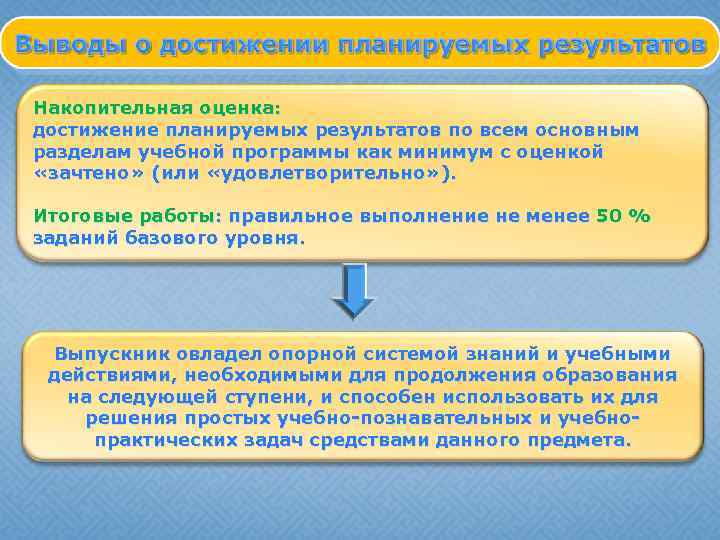Накопительная оценка: достижение планируемых результатов по всем основным разделам учебной программы как минимум с оценкой «зачтено» (или «удовлетворительно» ). Итоговые работы: правильное выполнение не менее 50 % заданий базового уровня. Выпускник овладел опорной системой знаний и учебными действиями, необходимыми для продолжения образования на следующей ступени, и способен использовать их для решения простых учебно-познавательных и учебнопрактических задач средствами данного предмета.