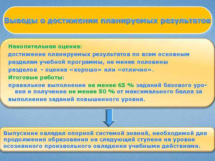 Накопительная оценка: достижение планируемых результатов по всем основным разделам учебной программы, не менее половины разделов - оценка «хорошо» или «отлично» . Итоговые работы: правильное выполнение не менее 65 % заданий базового уровня и получение не менее 50 % от максимального балла за выполнение заданий повышенного уровня. Выпускник овладел опорной системой знаний, необходимой для продолжения образования на следующей ступени на уровне осознанного произвольного овладения учебными действиями.