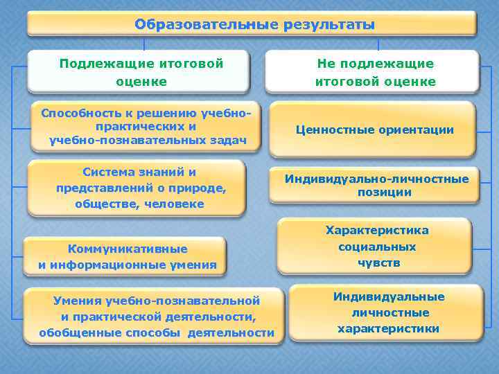 Образовательные результаты Подлежащие итоговой оценке Способность к решению учебнопрактических и учебно-познавательных задач Система знаний и представлений о природе, обществе, человеке Коммуникативные и информационные умения Умения учебно-познавательной и практической деятельности, обобщенные способы деятельности Не подлежащие итоговой оценке Ценностные ориентации Индивидуально-личностные позиции Характеристика социальных чувств Индивидуальные личностные характеристики
