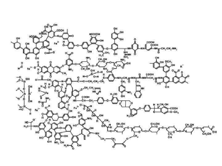 Состав и соотношение структурных компонентов в молекулах гуминовых кислот (Л. Н. Александрова, 1980) Фрагменты молекулы Компоненты Доля к массе, % Ароматическая гетероциклическая (ядро молекулы) и часть Азотсодержащие группировки типа пуриновых и пиримидиновых оснований и ароматических аминокислот и феноксазонов, одночленные и многочленные аромати ческие кольца различных степеней замещения типа фенолов и хинонов 30 50 Алифатическая алициклическая (периферическая молекулы) и часть Аминокислотные группировки, углеводные группировки 25 40 Функциональные группы COOH, COH, NH 2, =C=O и др. 10 25