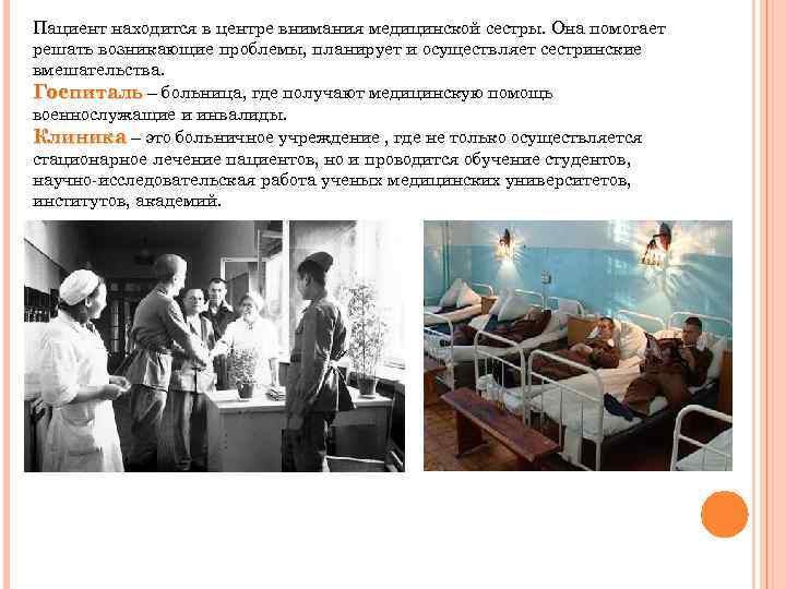 Пациент находится в центре внимания медицинской сестры. Она помогает решать возникающие проблемы, планирует и осуществляет сестринские вмешательства. Госпиталь – больница, где получают медицинскую помощь военнослужащие и инвалиды. Клиника – это больничное учреждение , где не только осуществляется стационарное лечение пациентов, но и проводится обучение студентов, научно-исследовательская работа ученых медицинских университетов, институтов, академий.