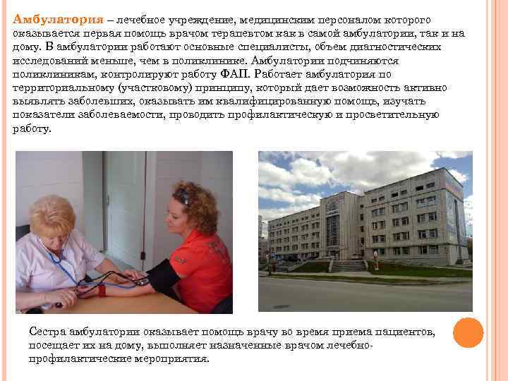 Амбулатория – лечебное учреждение, медицинским персоналом которого оказывается первая помощь врачом терапевтом как в самой амбулатории, так и на дому. В амбулатории работают основные специалисты, объем диагностических исследований меньше, чем в поликлинике. Амбулатории подчиняются поликлиникам, контролируют работу ФАП. Работает амбулатория по территориальному (участковому) принципу, который дает возможность активно выявлять заболевших, оказывать им квалифицированную помощь, изучать показатели заболеваемости, проводить профилактическую и просветительную работу. Сестра амбулатории оказывает помощь врачу во время приема пациентов, посещает их на дому, выполняет назначенные врачом лечебнопрофилактические мероприятия.