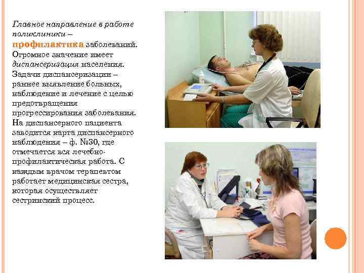 Главное направление в работе поликлиники – профилактика заболеваний. Огромное значение имеет диспансеризация населения. Задачи диспансеризации – раннее выявление больных, наблюдение и лечение с целью предотвращения прогрессирования заболевания. На диспансерного пациента заводится карта диспансерного наблюдения – ф. № 30, где отмечается вся лечебнопрофилактическая работа. С каждым врачом терапевтом работает медицинская сестра, которая осуществляет сестринский процесс.