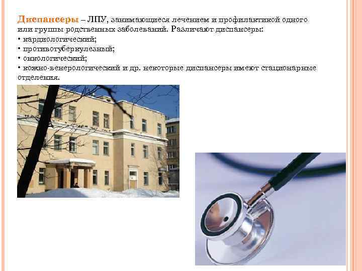 Диспансеры – ЛПУ, занимающиеся лечением и профилактикой одного или группы родственных заболеваний. Различают диспансеры: • кардиологический; • противотуберкулезный; • онкологический; • кожно-венерологический и др. некоторые диспансеры имеют стационарные отделения.