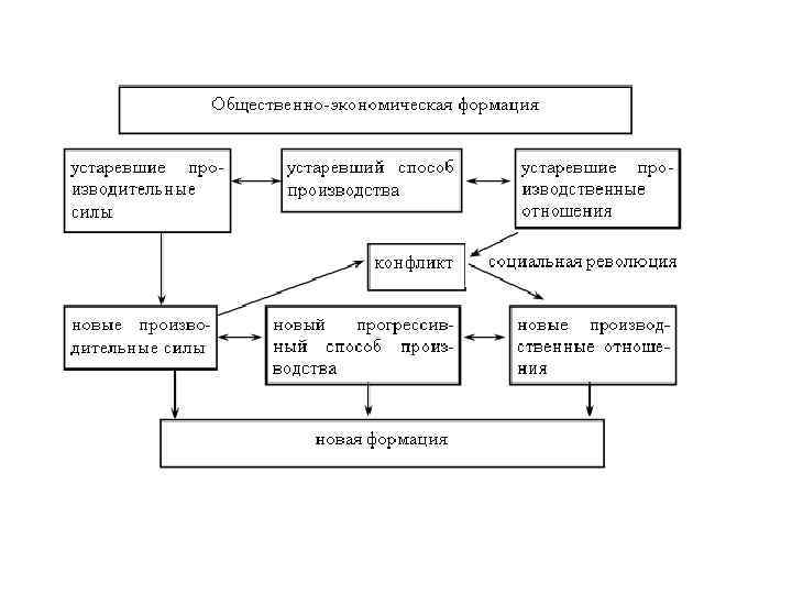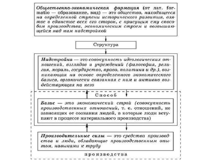 Каждая формация представляет целостную систему ее материальную основу составляет способ производства - исторически диалектическое единство производительных сил и производственных отношений. Компонентом системы любой общественно-экономической формации является не один исторический тип производственных отношений, а по крайней мере три и более: • остатки производственных отношений предыдущей формации • производственные отношения определенной формации • элементы будущей Например, при капитализме функционируют остатки феодальных производственных отношений, капиталистические и элементы посткапиталистических отношений.