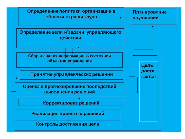 Принципиальная схема управления Системой ОТ в организации Органы управления управляющие воздействия (процедуры управления) Объекты управления информация о состоянии объектов Главная цель управления –обеспечение работы и развития производства в соответствии с планируемыми результатами и технико – экономическими показателями.