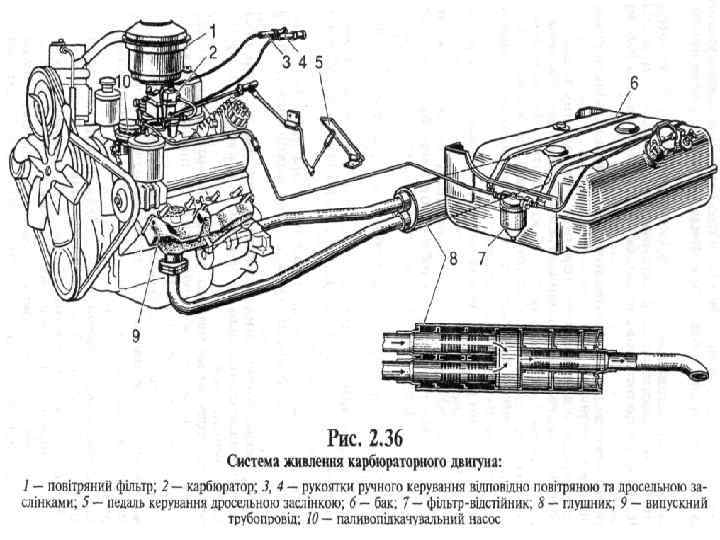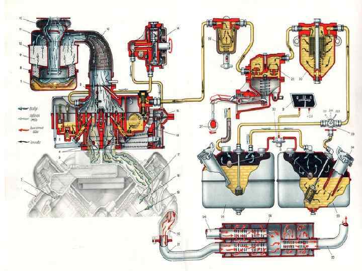 Воздух поступает в карбюратор через воздушный фильтр, который одновременно выполняет функцию глушителя шума, возникающего при впуске воздуха. Для ручного управления заслонками карбюратора служат рукоятки и, управление дроссельными заслонками осуществляется от ножной педали. 1 - топливный бак; 2 - топливопровод; 3 - топливный насос; 4 - фильтр очистки топлива; 5 - глушитель, 6 - выпускной коллектор; 7 - цилиндр двигателя; 8 - впускной коллектор; 9 - карбюратор; 10 - воздушный патрубок; 11 - фильтр очистки воздуха.