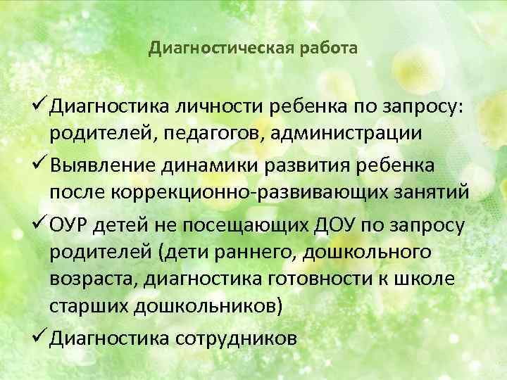 Диагностическая работа ü Диагностика личности ребенка по запросу: родителей, педагогов, администрации ü Выявление динамики развития ребенка после коррекционно-развивающих занятий ü ОУР детей не посещающих ДОУ по запросу родителей (дети раннего, дошкольного возраста, диагностика готовности к школе старших дошкольников) ü Диагностика сотрудников