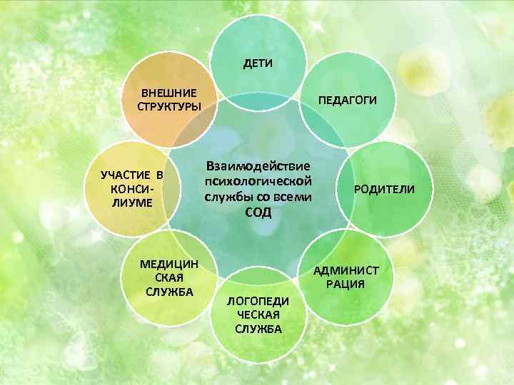 ДЕТИ ВНЕШНИЕ СТРУКТУРЫ УЧАСТИЕ В КОНСИЛИУМЕ МЕДИЦИН СКАЯ СЛУЖБА ПЕДАГОГИ Взаимодействие психологической службы со всеми СОД РОДИТЕЛИ АДМИНИСТ РАЦИЯ ЛОГОПЕДИ ЧЕСКАЯ СЛУЖБА