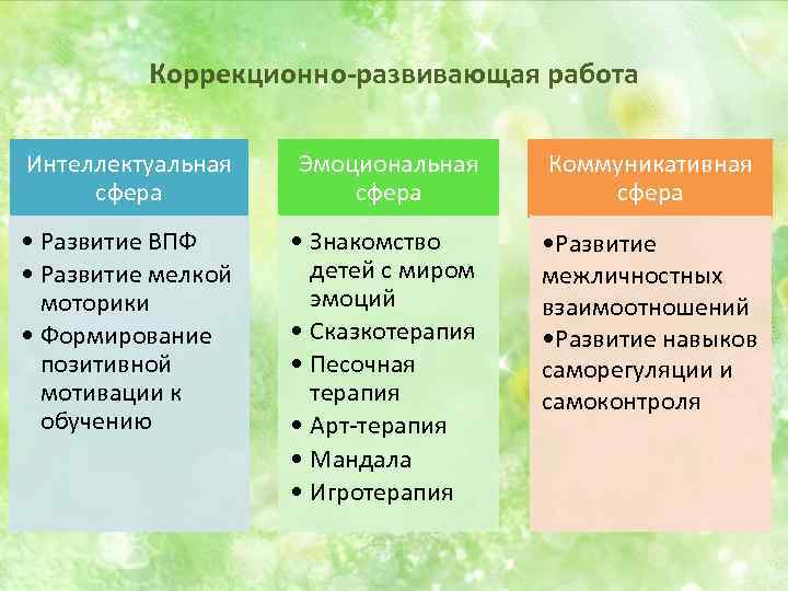 Коррекционно-развивающая работа v. Развитие и коррекция интеллектуальной сферы v. Развитие и коррекция эмоциональной сферы v. Подготовка к школе v. Адаптация к ДОУ