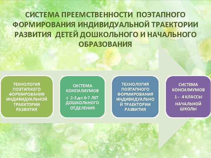 СИСТЕМА ПРЕЕМСТВЕННОСТИ ПОЭТАПНОГО ФОРМИРОВАНИЯ ИНДИВИДУАЛЬНОЙ ТРАЕКТОРИИ РАЗВИТИЯ ДЕТЕЙ ДОШКОЛЬНОГО И НАЧАЛЬНОГО ОБРАЗОВАНИЯ ТЕХНОЛОГИЯ ПОЭТАПНОГО ФОРМИРОВАНИЯ ИНДИВИДУАЛЬНОЙ ТРАЕКТОРИИ РАЗВИТИЯ СИСТЕМА КОНСИЛИУМОВ с 2 -3 до 6 -7 ЛЕТ ДОШКОЛЬНОГО ОТДЕЛЕНИЯ ТЕХНОЛОГИЯ ПОЭТАПНОГО ФОРМИРОВАНИЯ ИНДИВИДУАЛЬНО Й ТРАЕКТОРИИ РАЗВИТИЯ СИСТЕМА КОНСИЛИУМОВ 1 - 4 КЛАССЫ НАЧАЛЬНОЙ ШКОЛЫ