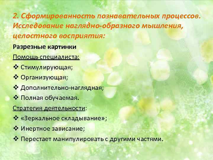 2. Сформированность познавательных процессов. Исследование наглядно-образного мышления, целостного восприятия: Разрезные картинки Помощь специалиста: v Стимулирующая; v Организующая; v Дополнительно-наглядная; v Полная обучаемая. Стратегия деятельности: v «Зеркальное складывание» ; v Инертное зависание; v Перестает манипулировать с другими частями.