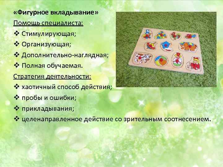 «Фигурное вкладывание» Помощь специалиста: v Стимулирующая; v Организующая; v Дополнительно-наглядная; v Полная обучаемая. Стратегия деятельности: v хаотичный способ действия; v пробы и ошибки; v прикладывания; v целенаправленное действие со зрительным соотнесением.