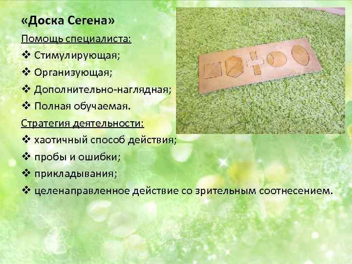 «Доска Сегена» Помощь специалиста: v Стимулирующая; v Организующая; v Дополнительно-наглядная; v Полная обучаемая. Стратегия деятельности: v хаотичный способ действия; v пробы и ошибки; v прикладывания; v целенаправленное действие со зрительным соотнесением.