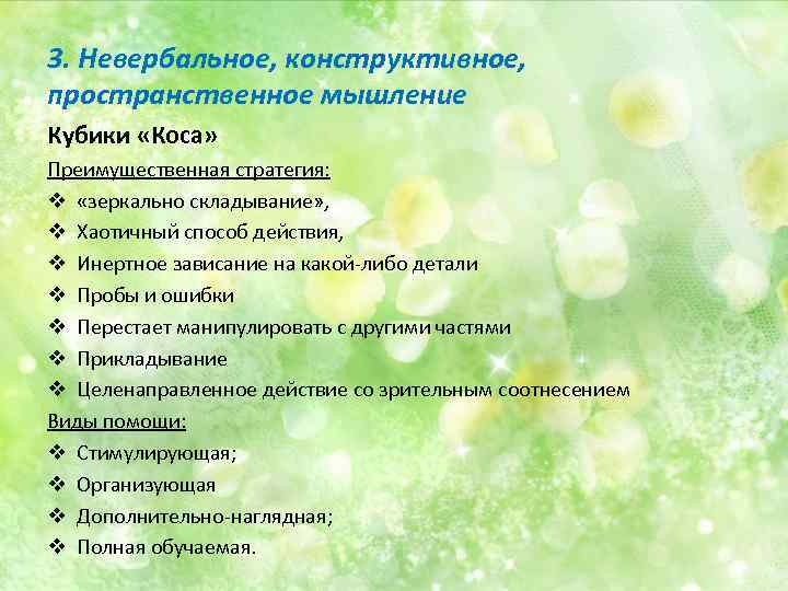 3. Невербальное, конструктивное, пространственное мышление Кубики «Коса» Преимущественная стратегия: v «зеркально складывание» , v Хаотичный способ действия, v Инертное зависание на какой-либо детали v Пробы и ошибки v Перестает манипулировать с другими частями v Прикладывание v Целенаправленное действие со зрительным соотнесением Виды помощи: v Стимулирующая; v Организующая v Дополнительно-наглядная; v Полная обучаемая.