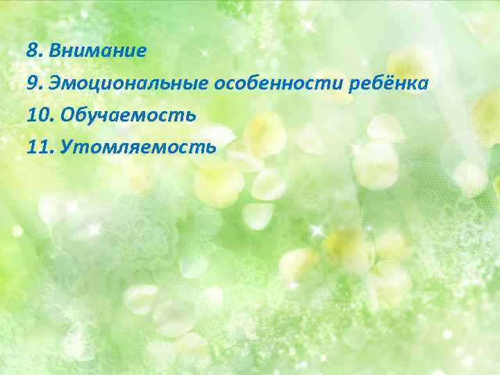 8. Внимание 9. Эмоциональные особенности ребёнка 10. Обучаемость 11. Утомляемость