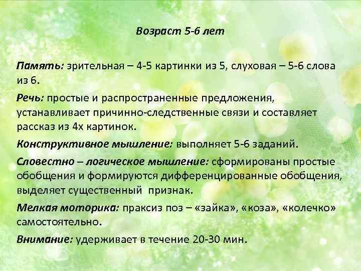 Возраст 5 -6 лет Память: зрительная – 4 -5 картинки из 5, слуховая – 5 -6 слова из 6. Речь: простые и распространенные предложения, устанавливает причинно-следственные связи и составляет рассказ из 4 х картинок. Конструктивное мышление: выполняет 5 -6 заданий. Словестно – логическое мышление: сформированы простые обобщения и формируются дифференцированные обобщения, выделяет существенный признак. Мелкая моторика: праксиз поз – «зайка» , «коза» , «колечко» самостоятельно. Внимание: удерживает в течение 20 -30 мин.