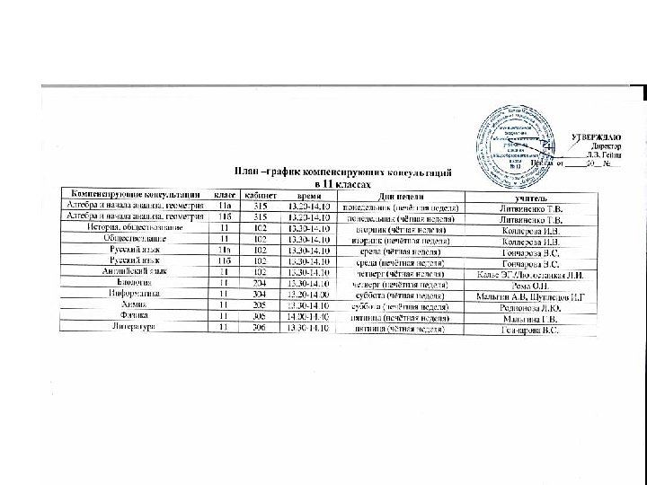 Оказание заместителями директора методической помощи учителям – предметникам, консультации по объективности выставления отметок, подачи учебного материала для обучающихся и родителей в период подготовки к ЕГЭ, ГИА Предмет Ф. И. О кабинет Русский язык, литература, история, обществознание, английский язык Мазурова С. Ф. -заместитель директора по УВР, учитель русского языка и литературы высшей категории Кабинет 210 Математика, физика Иванова С. А. - заместитель директора по УВР учитель математики высшей категории; Кабинет 210 География, биология, химия Церабаева С. В. -заместитель директора Кабинет по ВВВР, учитель географии, биологии 106 высшей категории; Информатика, по работе Голышева О. Ю. - заместитель с сайтами директора по УВР, учитель информатики высшей категории Кабинет 102