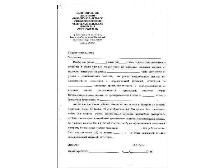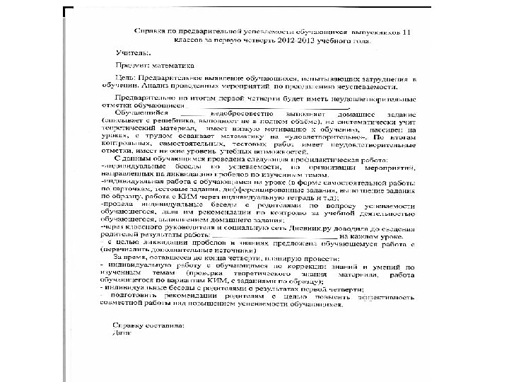Вовлечение родителей в учебно-воспитательный процесс: - информирование родителей выпускников о результатах диагностических работ; ü - проведение родительских собраний по вопросам подготовки к ГИА (общешкольных не менее двух раз в учебном году); ü - проведение индивидуальных бесед с родителями с целью усиления контроля за подготовкой слабоуспевающих детей к ГИА