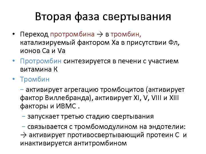 Вторая фаза свертывания • Переход протромбина → в тромбин, катализируемый фактором Ха в присутствии Фл, ионов Са и Vа • Протромбин синтезируется в печени с участием витамина К • Тромбин − активирует агрегацию тромбоцитов (активирует фактор Виллебранда), активирует XI, V, VIII и XIII факторы и ИВМС. − запускает третью стадию свертывания − связывается с тромбомодулином на эндотелии: → активирует противосвертывающий протеин С и инактивируется антитромбином