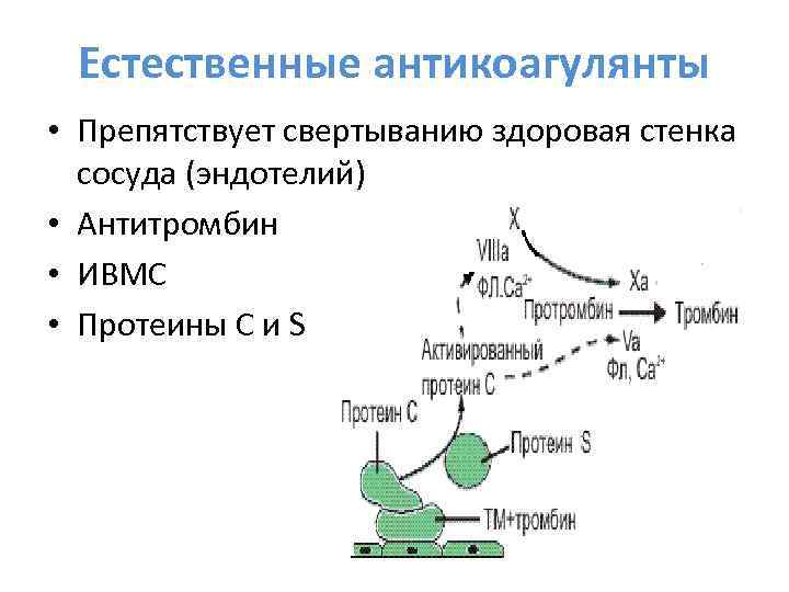 Естественные антикоагулянты • Препятствует свертыванию здоровая стенка сосуда (эндотелий) • Антитромбин • ИВМС • Протеины С и S