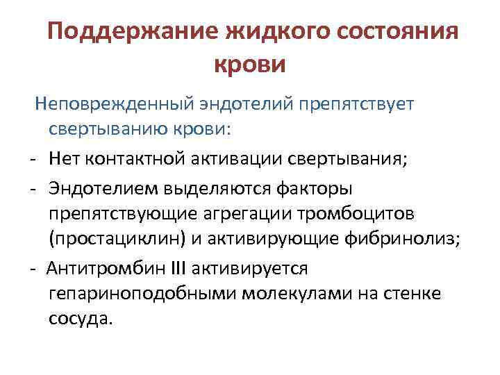 Поддержание жидкого состояния крови Неповрежденный эндотелий препятствует свертыванию крови: - Нет контактной активации свертывания; - Эндотелием выделяются факторы препятствующие агрегации тромбоцитов (простациклин) и активирующие фибринолиз; - Антитромбин III активируется гепариноподобными молекулами на стенке сосуда.