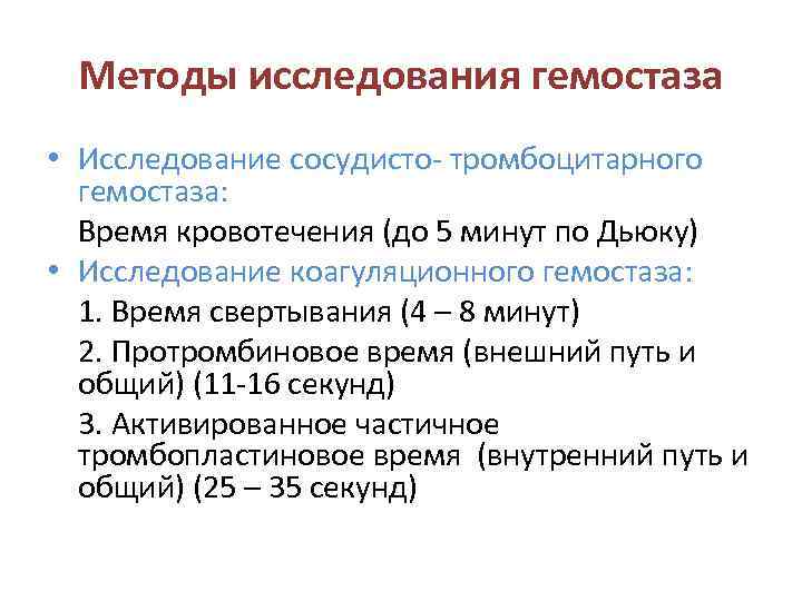 Методы исследования гемостаза • Исследование сосудисто- тромбоцитарного гемостаза: Время кровотечения (до 5 минут по Дьюку) • Исследование коагуляционного гемостаза: 1. Время свертывания (4 – 8 минут) 2. Протромбиновое время (внешний путь и общий) (11 -16 секунд) 3. Активированное частичное тромбопластиновое время (внутренний путь и общий) (25 – 35 секунд)